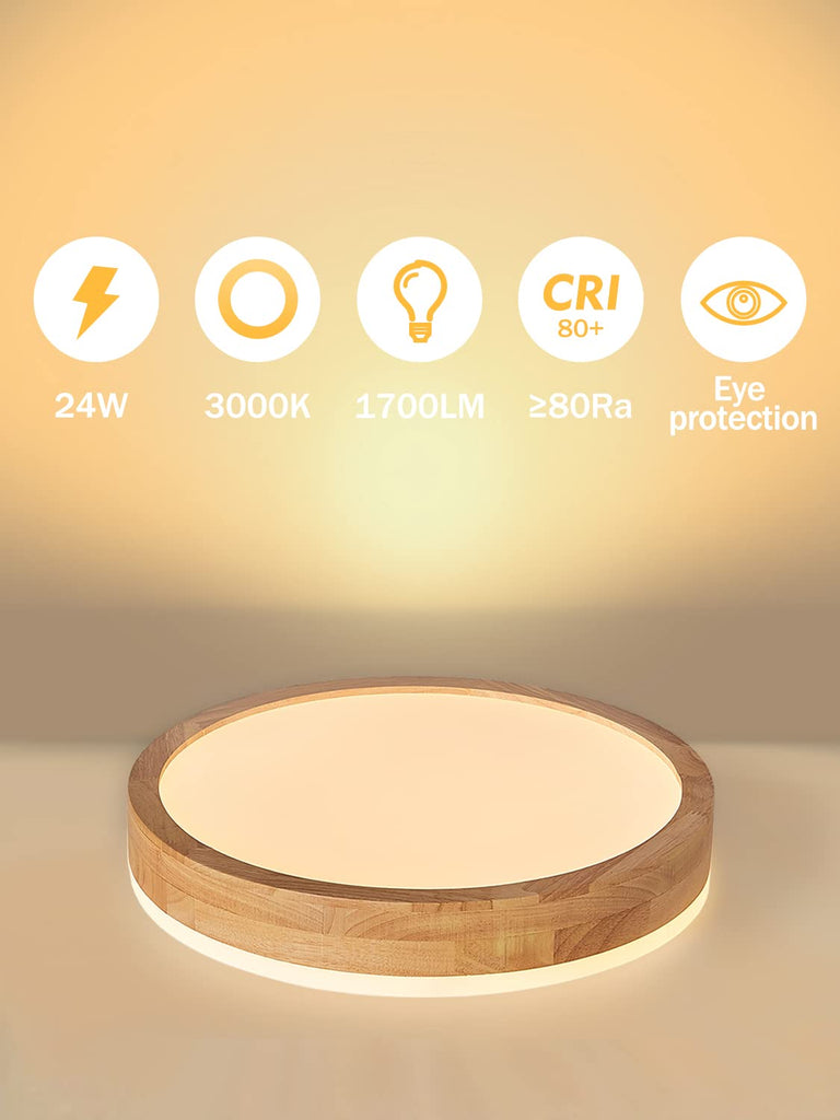 - ⬬ Moderne Deckenlampe led holz: Die Lampe Wohnzimmer nimmt ein elegantes und einfaches rundes Holzdesign an, Leistung: 24W, Farbtemperatur: 3000K warmweiß, bringt Sie dem warm und gemütlich Licht am nächsten. Das Aussehen der Deckenleuchte Küche kombiniert mit den exquisiten dekorativen Linien von Eiche ist nicht nur schön, sondern auch korrosionsbeständig und insektendicht, was die beste Wahl für Ihre Innen-Deckenbeleuchtung ist.