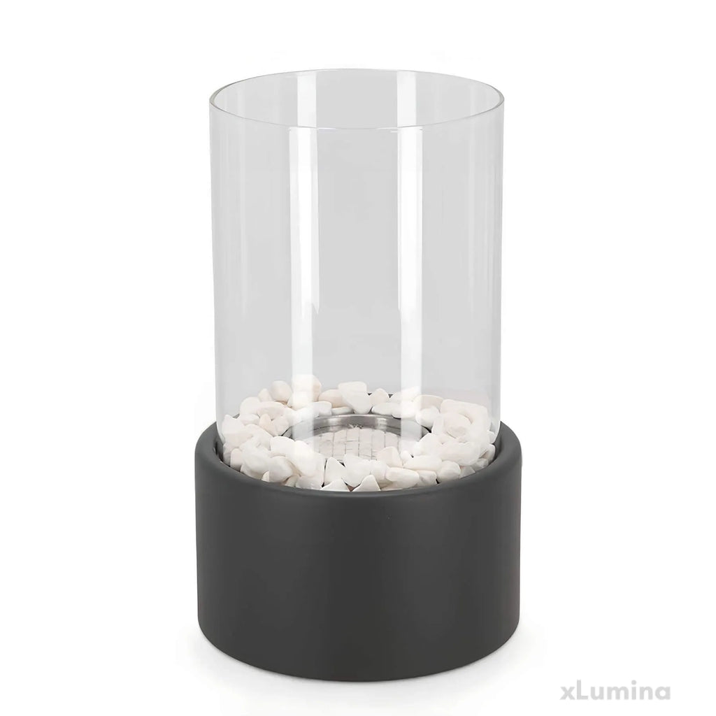 Gehäuse, Stahlsockel, Brennkammer, Glaszylinder, Feuerlöscher und Dekorationssteine.