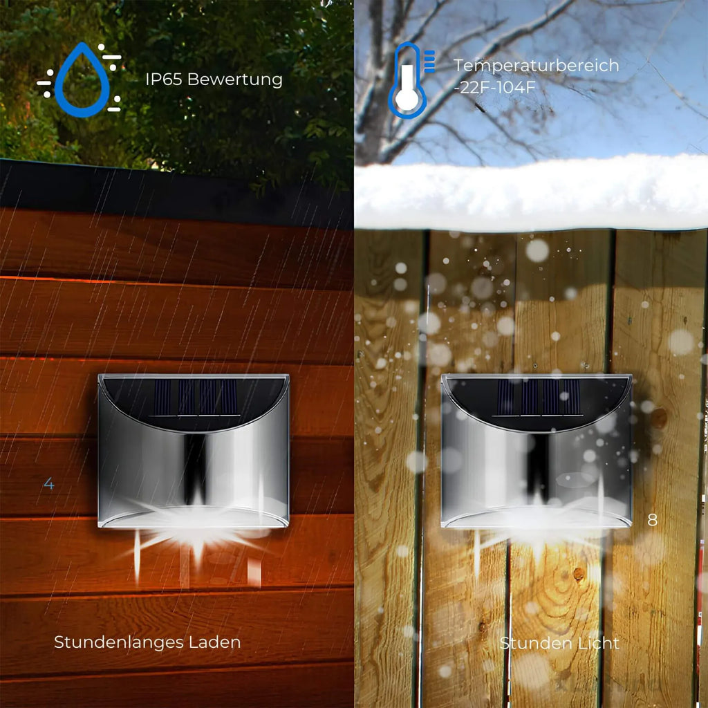 Diese Solar-LED-Wandleuchte aus Edelstahl bietet eine nachhaltige und wasserdichte Beleuchtungslösung für Ihren Garten, Hinterhof oder Rasen. Perfekt, um Ihre Außenbereiche stilvoll und umweltfreundlich zu erhellen.
