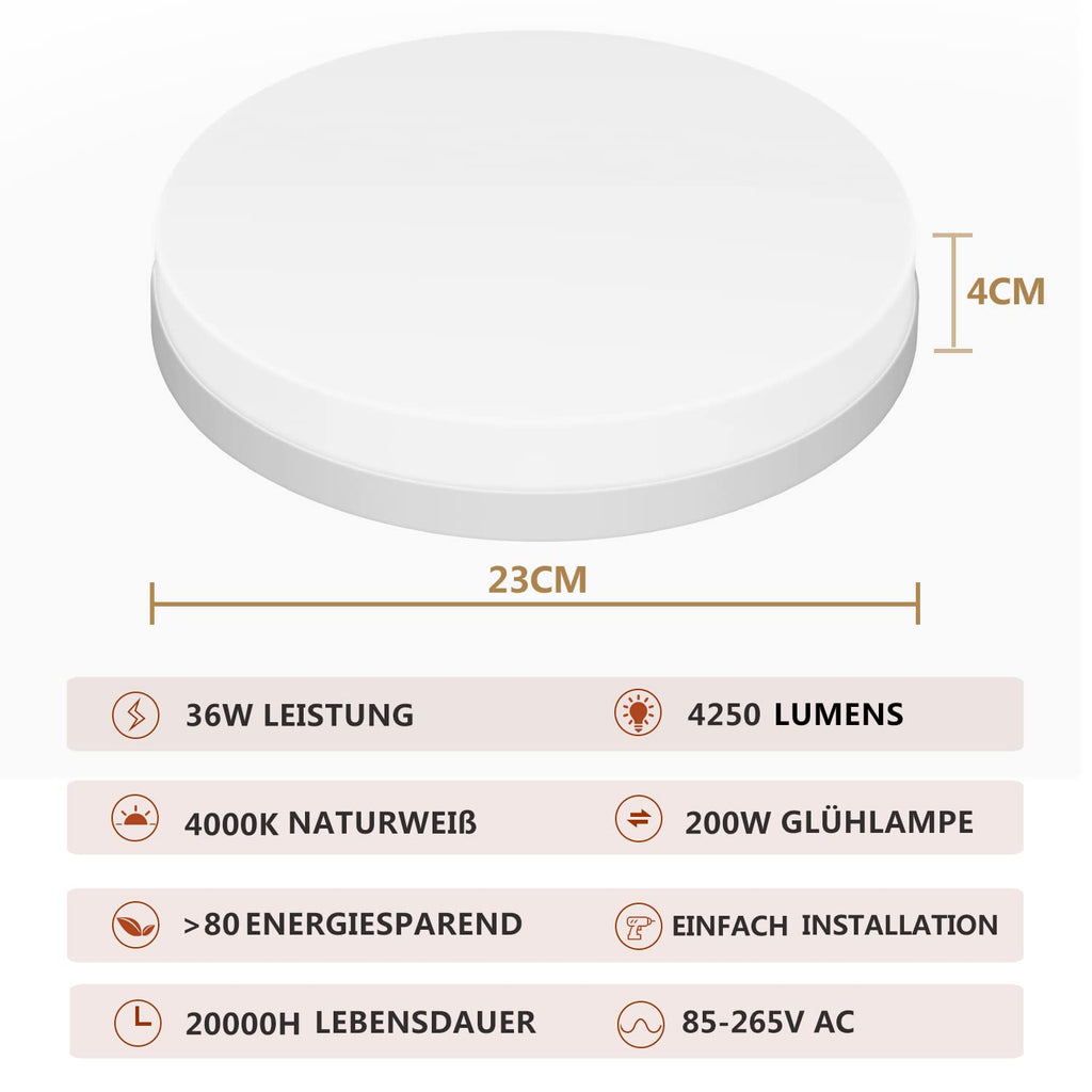 alt="SUNZOS LED Deckenleuchte Rund Deckenlampe 36W, 4250LM Led Lampen Deckenlampen, Neutralweiß 4000K Deckenleuchte Led für Lampe Wohnzimmer, Schlafzimmer, Flur, Ø23cm Deckenlampe">
